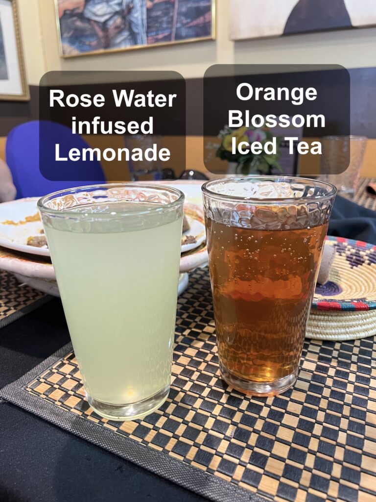 老闆娘非常熱情,為了確定餐點的辣度,她給我們一小份餐點和兩小卷衣索比亞烤餅(Injera),並教我們吃衣索比亞菜。吃法式用手撕(店內沒看到餐具)一片大小適中的烤餅,用烤餅夾一點餐盤上的料直接放到嘴裡享用,帶微酸味並有彈性的 Injera 夾上香料加滿的主菜,讓我和朋友瞬間震驚到說不出話!我們點了 1 份老闆娘推薦的雞肉套餐、1 份羊肉套餐和 2 杯飲料!不論是餐點或飲料都非常好吃!