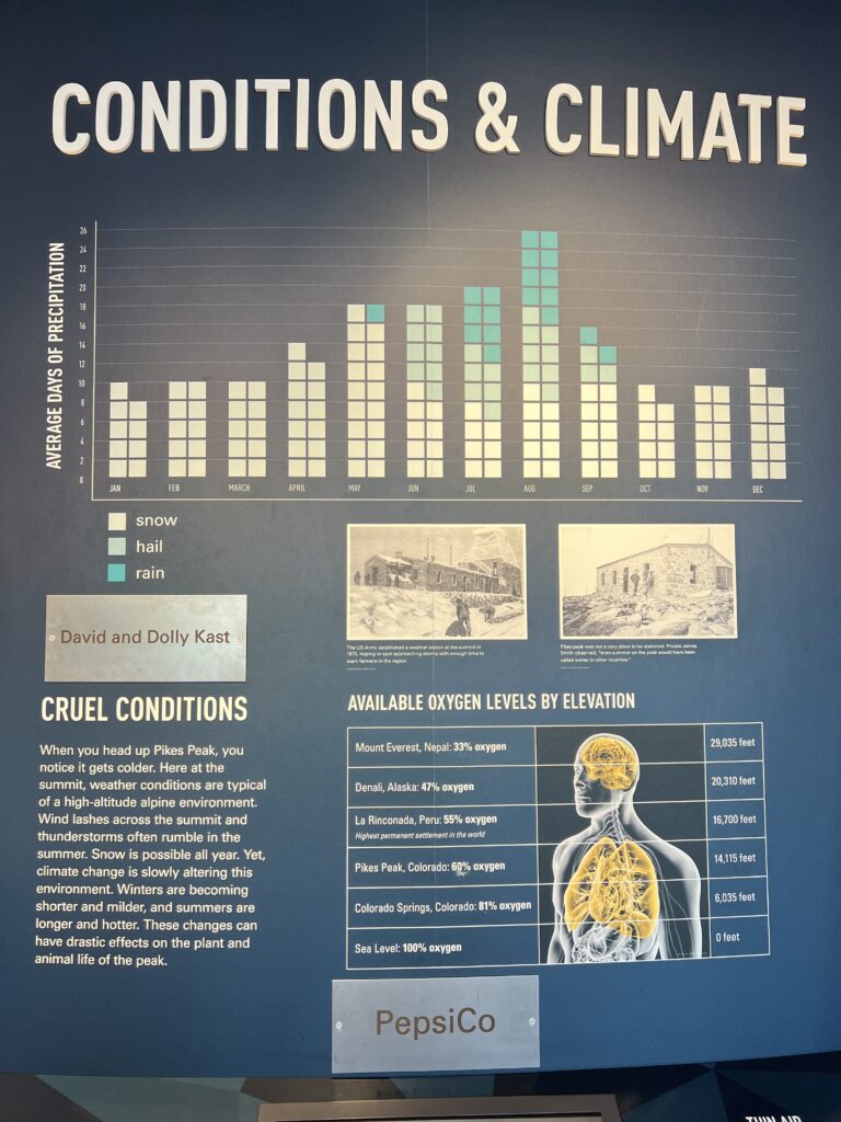 遊客中心內有整座山的歷史、氣候介紹(其中最令人哭笑不得的是有一匹馬參加了登上山頂的馬拉松,成功完賽,但在 2 年後被閃電擊中死了),同時賣著超香且人手一盒的甜甜圈(味道很普通)~