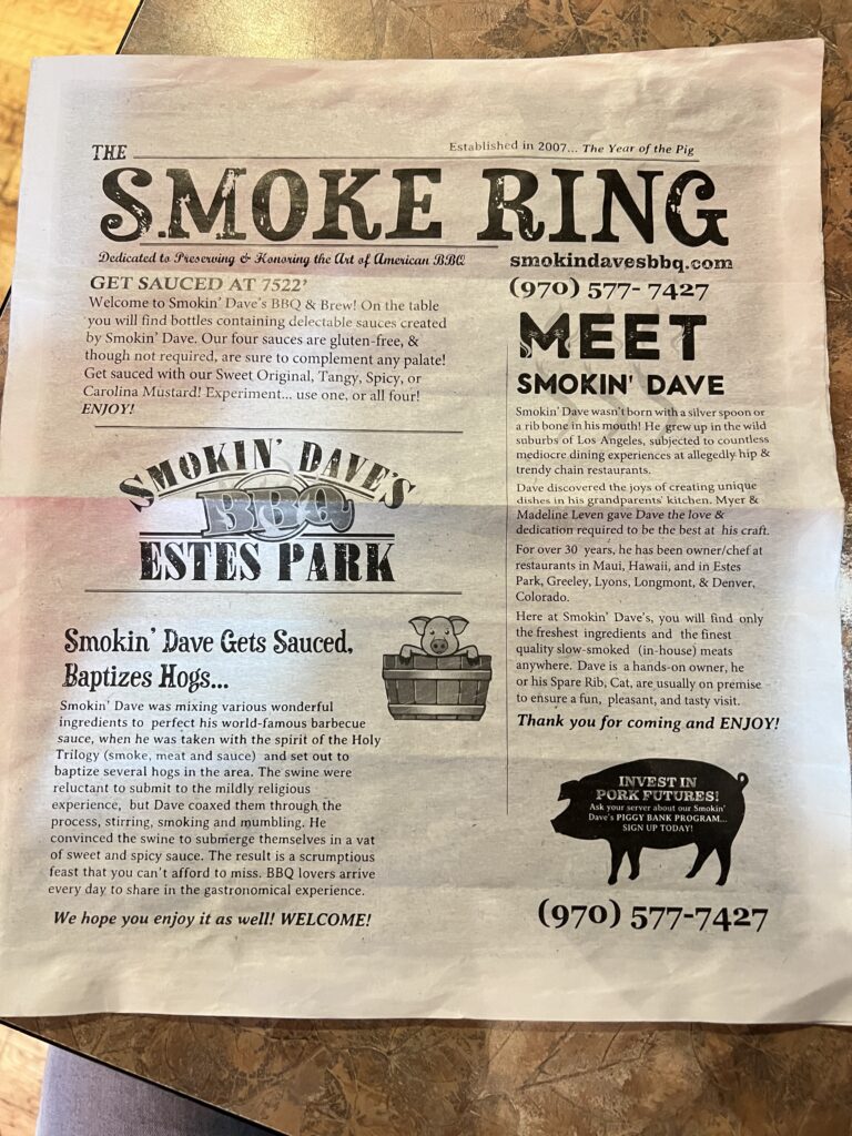 - 18:00 晚餐:Smokin’ Dave’s BBQ – ESTES PARK(美式烤肉)