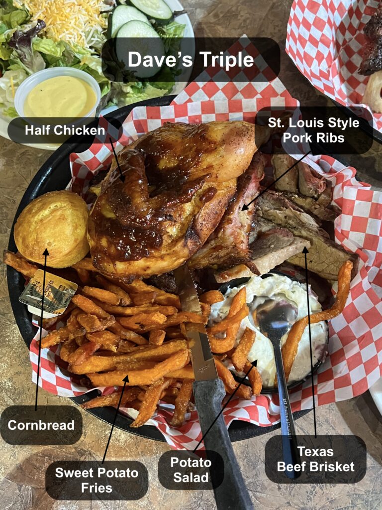 我們點了一份三種肉的套餐 (Dave’s Triple,可以選 3 個肉、2 個配菜)和美州水牛牛肋排,餐點份量就如網上傳言的便宜又大份,3 個剛爬完山飢腸轆轆的成年男性吃剛剛好!對來自德州的我們來說,這間烤肉在德州應該存活不下去!