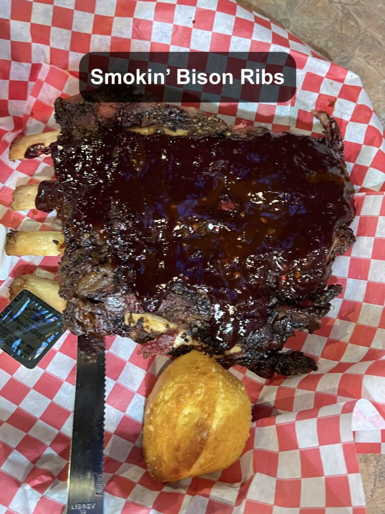 晚餐選擇網路上推薦的 Smokin’ Dave’s BBQ,我們大概等了 20 分鐘就入座了,整間店是美國酒吧氛圍,烤肉方面最大的特色就是在德州沒看過的美洲水牛牛肋排(Smoki’ Bison Ribs)!