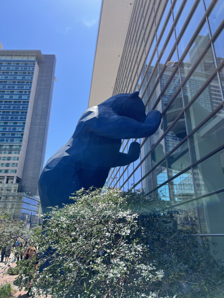 這隻藍色巨熊位在丹佛的會展中心旁邊(Colorado Convention Center)並且從窗戶好奇地看著裡面的人的活動,是丹佛的代表性地標,我們當天剛好遇到類似動漫展的活動,所以場館外很熱鬧~
